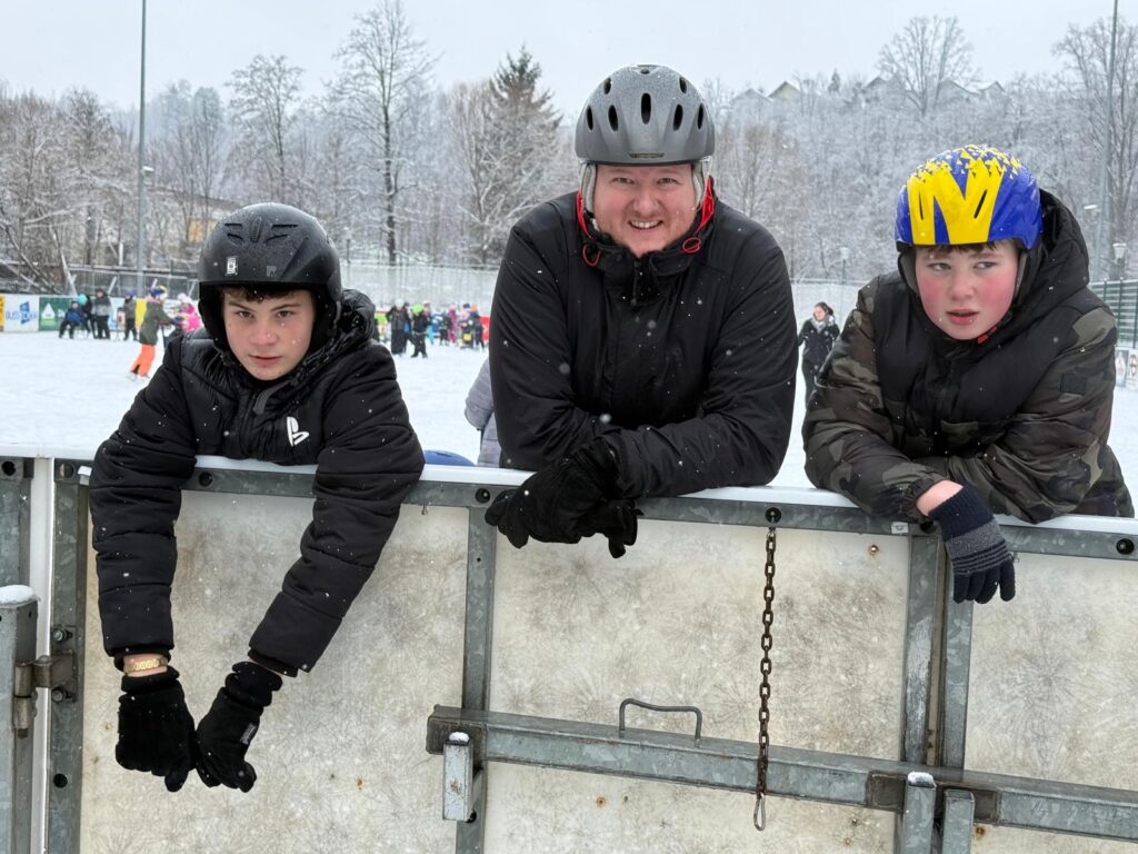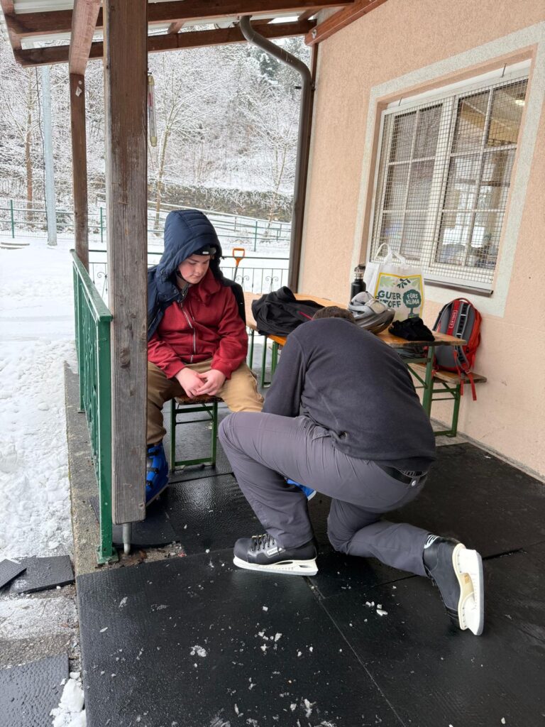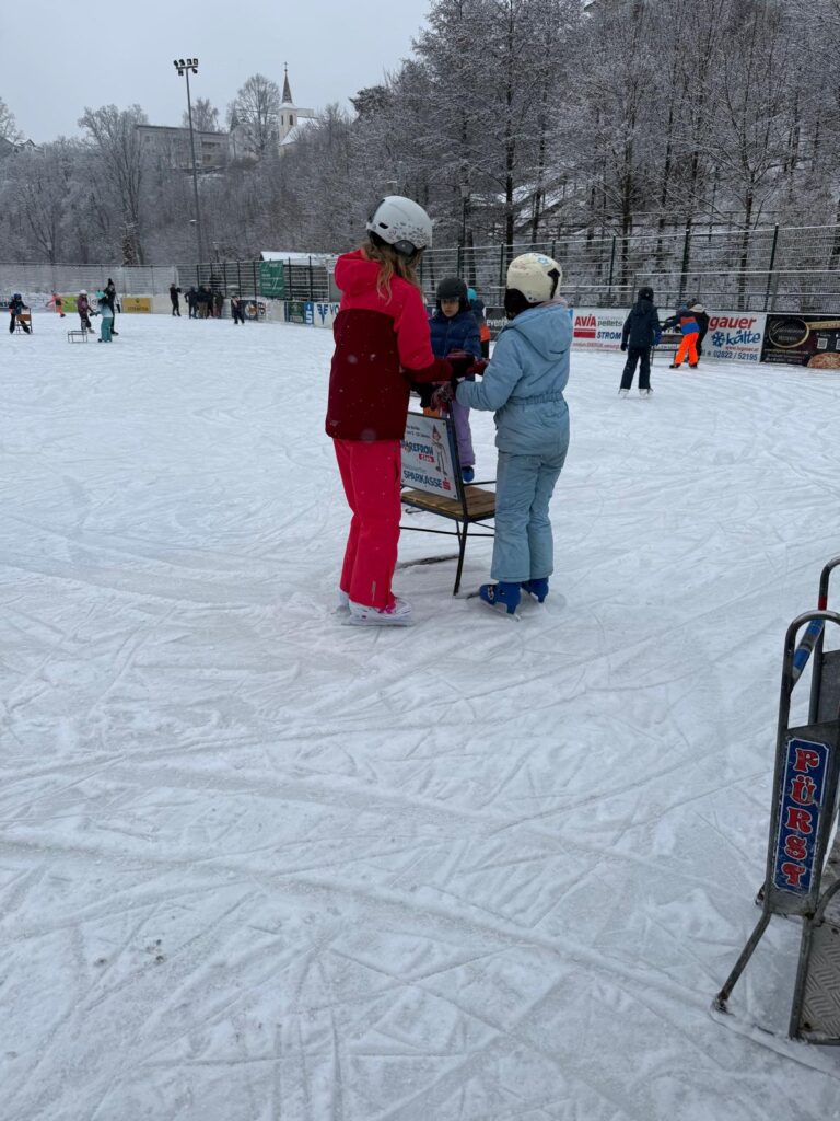 Dort angekommen wurden die Schlittschuhe angezogen und mit großer Vorfreude ging es für alle auf das Eis. Für einige Kinder war es das erste Mal auf Schlittschuhen. Anfangs noch etwas vorsichtig, wurden sie jedoch schnell mutiger. Schon nach kurzer Zeit drehten auch die Anfänger ihre ersten sicheren Runden. Die geübteren Eisläuferinnen und Eisläufer halfen fleißig mit, gaben Tipps und unterstützten ihre Mitschülerinnen und Mitschüler. So konnten alle schöne Erfolgserlebnisse sammeln.